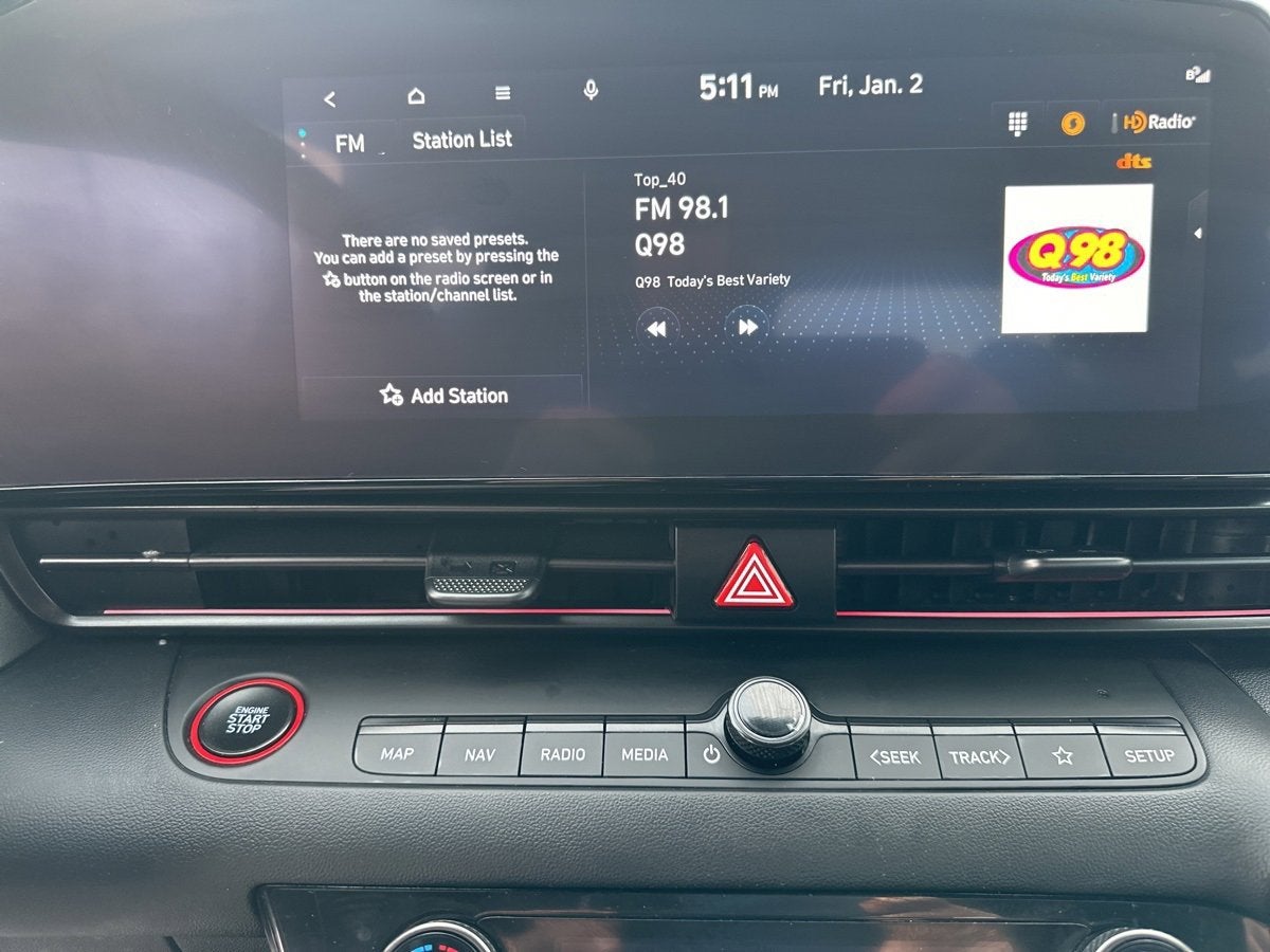 Well Equipped with: Option Group 01, 18 x 7.5J Alloy Wheels, 4-Wheel Disc Brakes, 8 Speakers, ABS brakes, Air Conditioning, Alloy wheels, AM/FM radio: SiriusXM, Apple CarPlay & Android Auto, Auto High-beam Headlights, Automatic temperature control, Brake assist, Bumpers: body-color, Carpeted Floor Mats, Combination Cloth & Leatherette Seating Surfaces, Delay-off headlights, Driver door bin, Driver vanity mirror, Dual front impact airbags, Dual front side impact airbags, Electronic Stability Control, Emergency communication system: Bluelink+, Exterior Parking Camera Rear, First Aid Kit, Four wheel independent suspension, Front anti-roll bar, Front Bucket Seats, Front Center Armrest, Front dual zone A/C, Front reading lights, Fully automatic headlights, Heated door mirrors, Heated front seats, Heated Front Sport Bucket Seats, Illuminated entry, Leather Shift Knob, Leather steering wheel, Low tire pressure warning, Navigation System, Occupant sensing airbag, Outside temperature display, Overhead airbag, Overhead console, Panic alarm, Passenger door bin, Passenger vanity mirror, Power door mirrors, Power driver seat, Power moonroof, Power steering, Power windows, Radio: AM/FM/HD/SiriusXM Display Audio, Rear anti-roll bar, Rear Bumper Applique, Rear seat center armrest, Rear side impact airbag, Rear window defroster, Remote keyless entry, Reversible Cargo Tray, Security system, Speed control, Speed-sensing steering, Split folding rear seat, Spoiler, Sport steering wheel, Steering wheel mounted audio controls, Tachometer, Telescoping steering wheel, Tilt steering wheel, Traction control, Trip computer, Turn signal indicator mirrors, Variably intermittent wipers, and Wheel Locks.